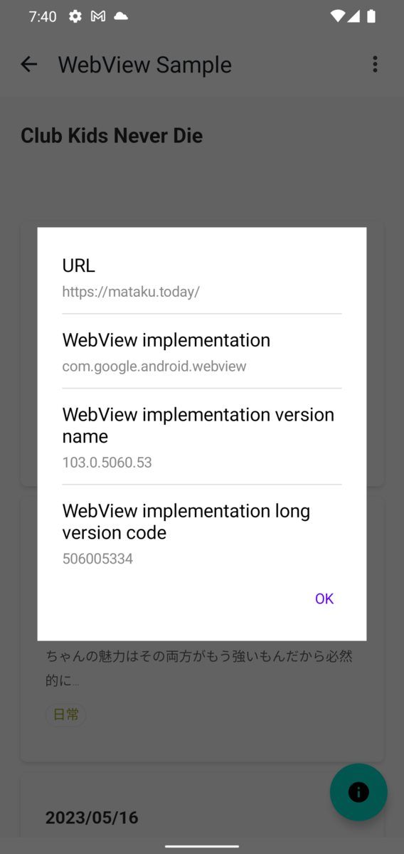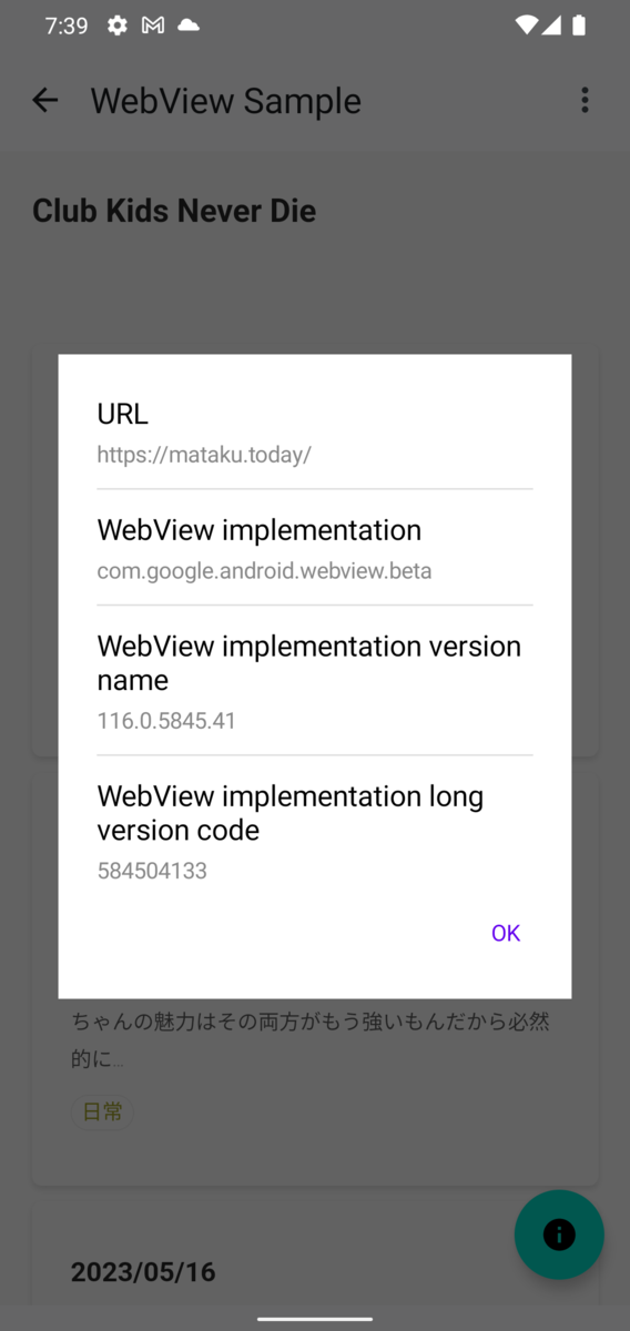 PackageInfo が取得できるということは、versionName (versionCode) も取得できるので、例えば バージョン X 以下のものを利用していたらなにかアクションするようなことが可能になる。そんな話を仕事でしていたのでこの時代でも WebView で悩む機会はあるんだなと感じた。