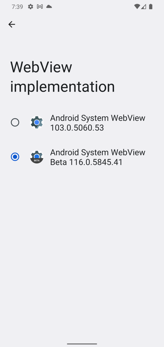 WebView 実装で何を使うかは開発者向けオプションから選択できる。Android 10 以降では WebView がデフォルトなので、それ以降なら何もしなければ WebView なはず。